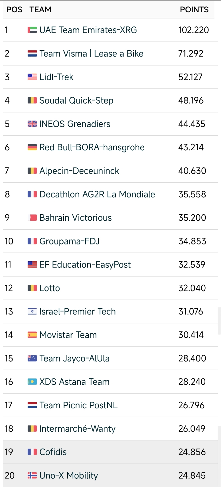 阿斯塔納車隊(duì)。隨著年初周密訓(xùn)練比賽計(jì)劃和團(tuán)隊(duì)強(qiáng)大戰(zhàn)斗力,不僅在6月填平2023-2024賽季挖下積分大坑,而且在7月至9月保持強(qiáng)勁石頭,有望沖擊第15名排位,目前保級(jí)無憂;