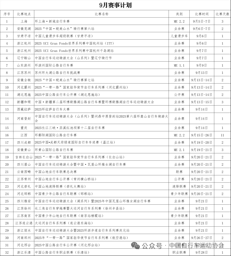 根據(jù)中自協(xié)公布賽事計劃,9月國內(nèi)舉辦協(xié)會主辦的賽事共32場,賽事種類、舉辦地呈現(xiàn)出全面開花現(xiàn)象,側(cè)面反映出各地積極承辦賽事意愿和能力。