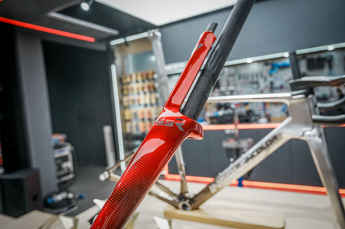 SSR的側(cè)面很纖細(xì),看起來不像是一臺(tái)純氣動(dòng)車。但是,SSR 的頭管非常窄,迎風(fēng)面積非常小,它的氣動(dòng)性比傳統(tǒng)意義上的氣動(dòng)車更好。得益于 SSR 更小的管型表面積,所以能夠?qū)崿F(xiàn)更輕的重量。SSR,54 碼的車架,卻只有 750 克。市面上很多純氣動(dòng)車很難做到 1000g以內(nèi)。做為銀石風(fēng)洞實(shí)驗(yàn)室的“?汀, INCOLOR也推薦了很多中國品牌去銀石進(jìn)行產(chǎn)品試驗(yàn)。