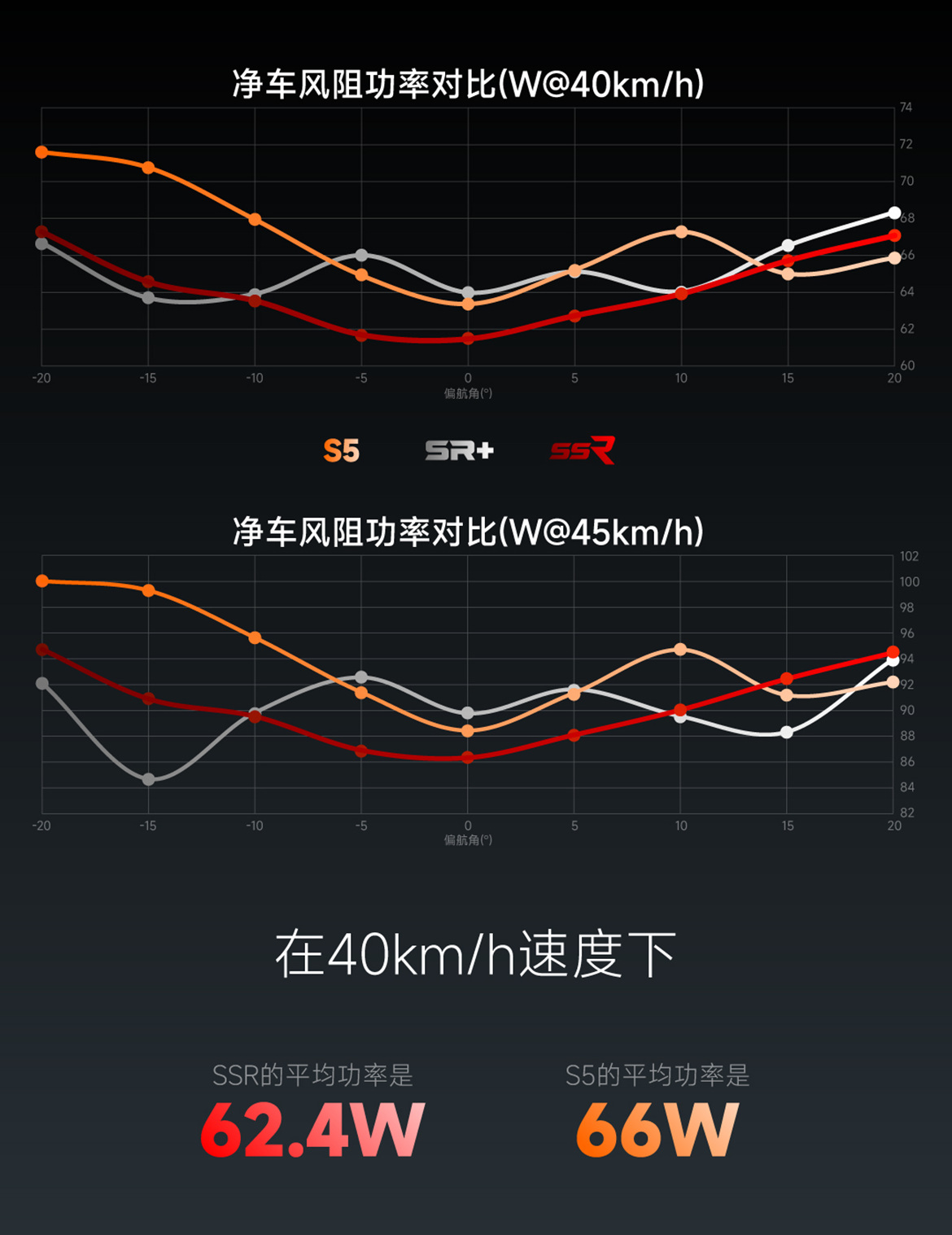 在不帶假人的測試工況中SSR 和 S5 之間的數(shù)據(jù)對(duì)比,,SSR 和 S5在40公里每小時(shí)速度下:SSR的平均功率是62.4瓦;S5的平均功率是66瓦;SSR比S5節(jié)省了3.6瓦。