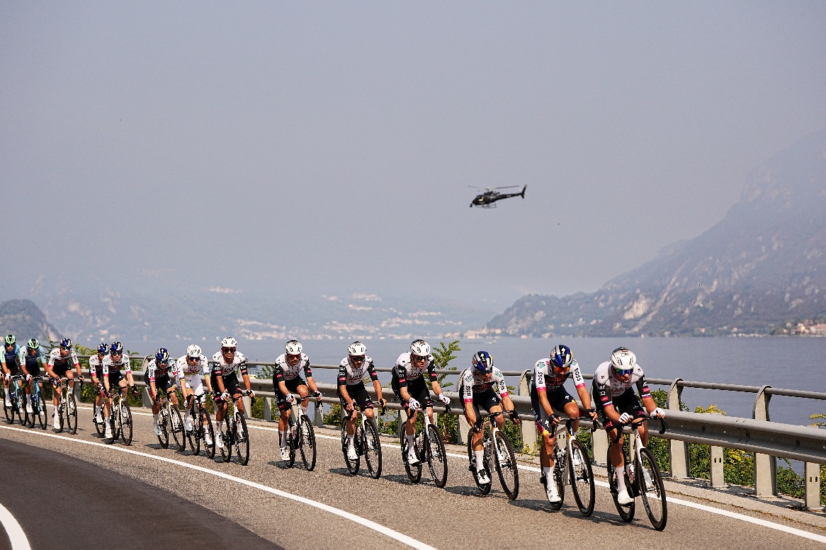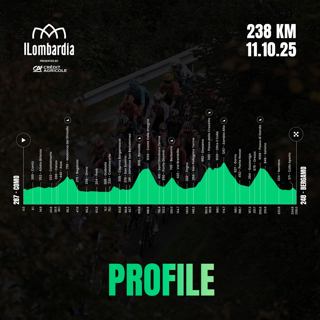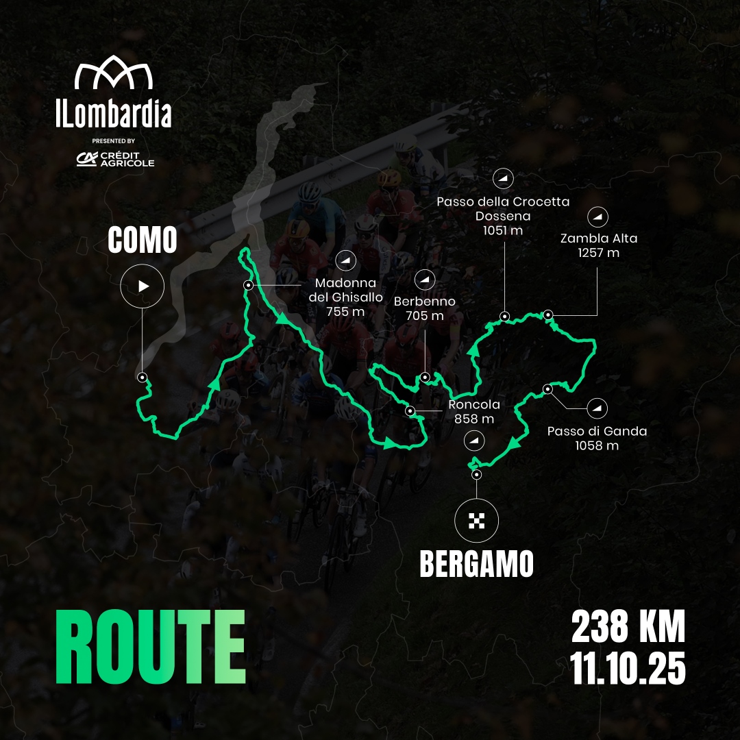 賽事路線。比賽賽程241公里,先后翻越多座大山,總爬升4600米。選手們從意大利北部的科莫出發(fā)后穿越意大利北部狹窄蜿蜒的公路,途經(jīng)馬多納德爾吉薩洛山(坡程8.8公里,平均坡度3.9%)、圣戈塔多山(坡程2.7公里,平均坡度6.5%)、龍科拉山(7.5公里,平均坡度7.4%)、貝爾山(坡程6.9公里,平均坡度4.9%)、克羅切塔山(坡程11.7公里,平均坡度5.8%)、扎姆拉阿爾塔山(坡程9.8公里,平均坡度3.3%),甘達(dá)山(坡程10公里,平均坡度7.1%),其中甘達(dá)山下坡期間遇上19個(gè)發(fā)夾彎的長(zhǎng)下坡,這個(gè)期間各車隊(duì)副將們基本被消耗殆盡,各支車隊(duì)主將將會(huì)殊死一搏,貝加莫山(1.3公里,坡度7.4%),隨后下坡返回貝加莫終點(diǎn)。