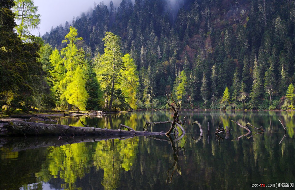 從九龍到伍須海方向的路是無盡的上坡,很多地方我都只能推一段騎一段,好在一路都在景色漂亮的原始森林里,停下休息的時(shí)候還能拿著舉著相機(jī)喀嚓幾下,讓路過的游客以為我其實(shí)可以騎上去,不過是因?yàn)樘矏鄞笞匀欢坏貌煌纯嗟赝O屡恼铡?br/> 到達(dá)伍須海岸邊,看著在谷歌地球上翻看了很多次的景物,我在湖邊到處晃蕩。其實(shí)這里游客還是不少的,特別是到了傍晚,從湖對(duì)面返回的游客一隊(duì)接一隊(duì),絡(luò)繹不絕。我逛到牧民的小木屋附近拍照,遇到的牧民一聽我說是自己一個(gè)人,個(gè)個(gè)都立即告訴我住在草壩邊緣的旅館里也有一個(gè)獨(dú)自旅行的背包客。有趣的是,沒過幾分鐘,我就遇到了那個(gè)傳說中的獨(dú)行者。