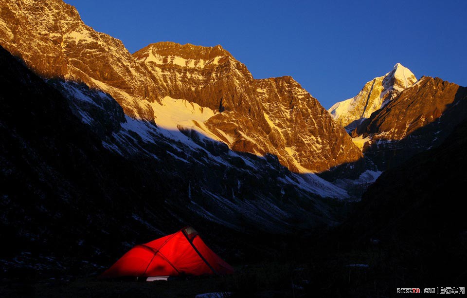 在海子溝深處一個(gè)能看到四姑娘山四峰的地方露營,這是早晨的日照金山。